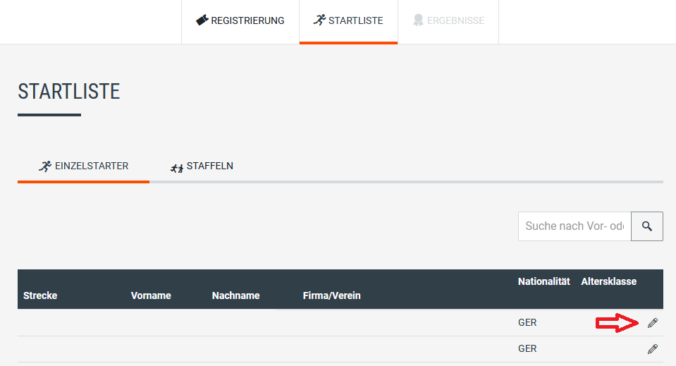 Als erstes öffnet Ihr die Starterliste und sucht Euren Namen