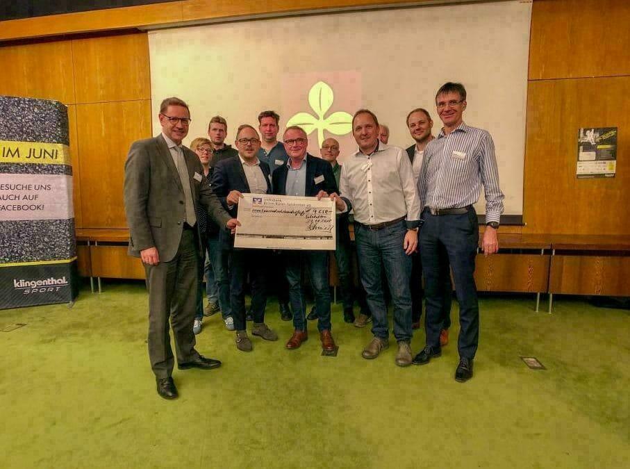 Die Akteure des Klingenthal Sport Salzkotten Marathon mit Bürgermeister Ulrich Berger (links) und Marathon-Organisator Sascha Wiczynski (vorne 2.v. rechts) freuen sich den Spendenscheck in Höhe von 9.650,- € an die Vereine übergeben zu können.